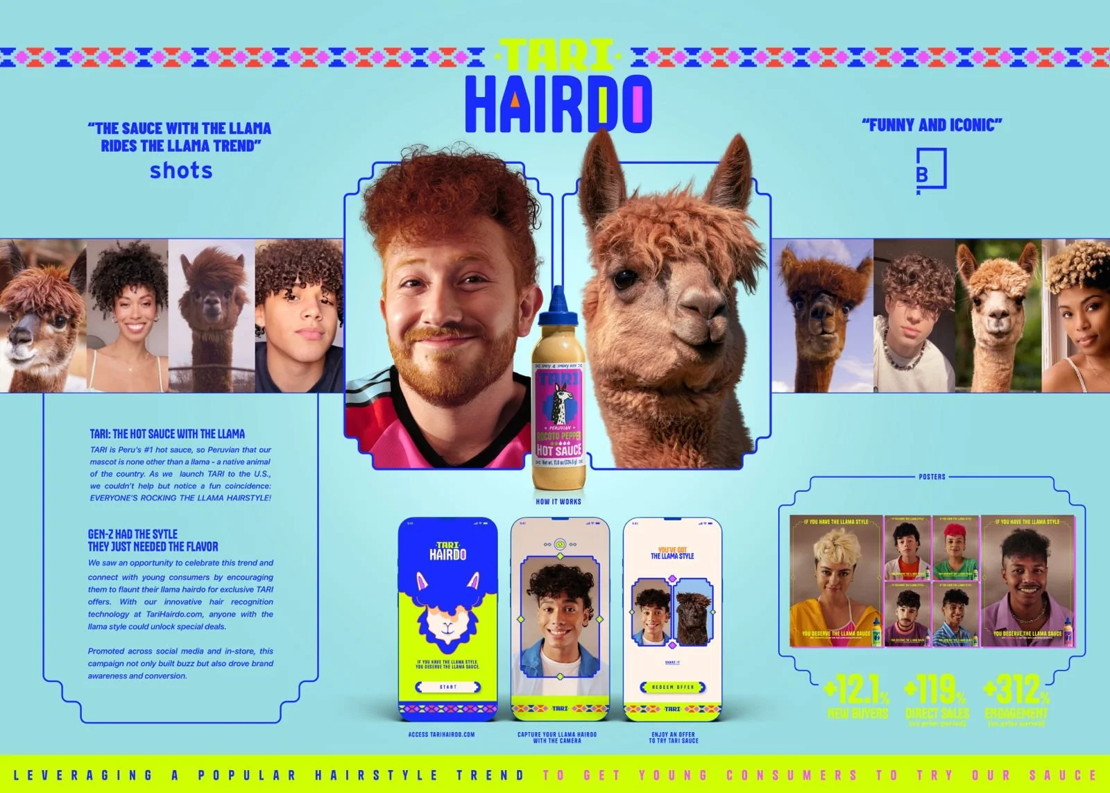 TARI is Peru’s #1 hot sauce – so Peruvian that their mascot is none other than the llama, which is a native animal of the country. As we launch TARI in the U.S., we couldn’t help but notice a fun coincidence: everyone is rocking the LLAMA HAIRSTYLE! So we saw an opportunity to celebrate this trend and connect with young consumers by encouraging them to flaunt their llama hairdo for exclusive TARI offers. With our innovative hair recognition technology at TariHairdo.com, anyone with the llama style could unlock special deals. Promoted across social media and in-store, this campaign not only built buzz, but also drove brand awareness and conversion.